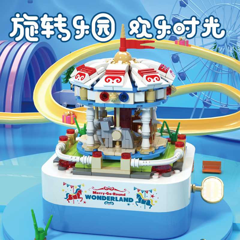 將積木與音樂盒完美結合,好玩又時尚。純機械動力設計更環保,音樂盒發條轉動帶整個樂園旋轉,益智拼搭,時尚美觀,還能充當家居精品擺件。
