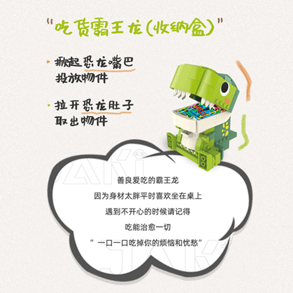 善良愛吃的霸王龍, 因?yàn)樯聿奶制綍r(shí)喜歡坐在桌上, 遇到不開心的時(shí)候, 請(qǐng)記得吃能治愈一切, 一口一口吃掉你的煩惱和憂愁”